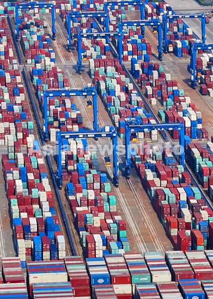 2024年6月9日拍摄的忙碌的江苏南通港通海港区集装箱作业区堆场。
