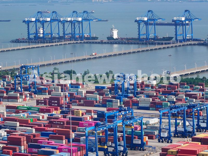 2024年6月9日拍摄的忙碌的江苏南通港通海港区集装箱作业区。 据南通市交通运输局提供的信息,2024年前5月,南通港完成货物吞吐量1.2亿吨,集装箱吞吐量完成102.5万标箱,同比增长40.2%。通海港区是海轮进入长江12.5米深水航道后北岸的第一个港区,也是江苏省南通市重点打造的现代化集装箱港区和江海联运枢纽港,投产运营以来,集装箱吞吐量逐年增加。