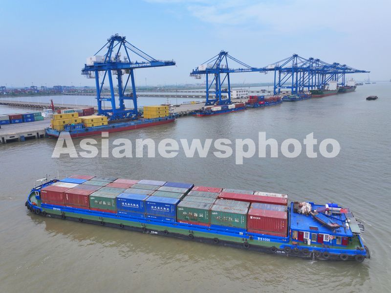 2024年6月9日拍摄的忙碌的江苏南通港通海港区集装箱作业区。 据南通市交通运输局提供的信息,2024年前5月,南通港完成货物吞吐量1.2亿吨,集装箱吞吐量完成102.5万标箱,同比增长40.2%。通海港区是海轮进入长江12.5米深水航道后北岸的第一个港区,也是江苏省南通市重点打造的现代化集装箱港区和江海联运枢纽港,投产运营以来,集装箱吞吐量逐年增加。