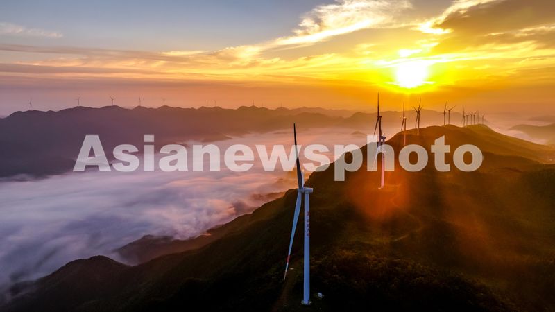 图片说明:2024年6月13日,江西省瑞昌市洪下乡蜈蚣山风电场,一台台发电机矗立在群山、云海之中,勾勒出一幅仙境般的美丽画卷。