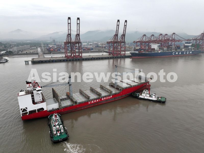图片说明:2024年6月19日下午,宁波舟山港金塘港区大浦口集装箱码头第35条“一带一路”航线首航船到港,将从这里装载700标箱的家用电器、服装等货物,驶往沙特阿拉伯的吉达港。