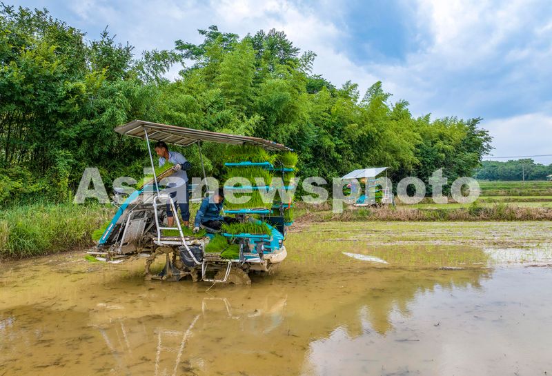 图片说明:2024年6月21日,在安徽省芜湖市繁昌区平铺镇茶冲村,农机专业合作社农机手驾驶插秧机为对农户提供插秧服务。