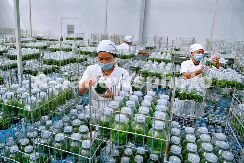 图片说明:2024年6月23日,在江苏省盐城市响水县黄圩镇铁皮石斛培育基地内,工作人员在智能化连体环控温室内管理培育的新种苗。