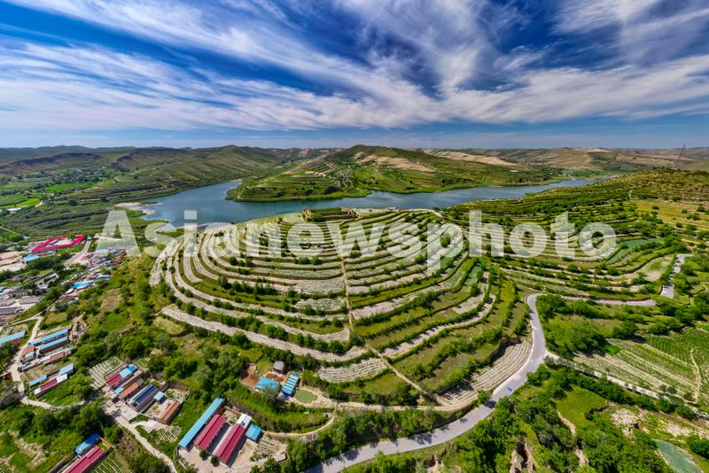 2024年6月23日,宁夏回族自治区固原市西吉县震湖乡,西吉震湖清澈碧透,梯田景观层层叠叠,与民宿、村落、绿植等,构成一幅夏日山水交融的美丽生态画卷。