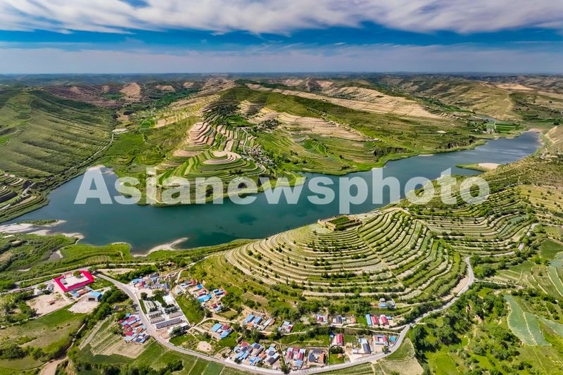 2024年6月23日,宁夏回族自治区固原市西吉县震湖乡,西吉震湖清澈碧透,梯田景观层层叠叠,与民宿、村落、绿植等,构成一幅夏日山水交融的美丽生态画卷。