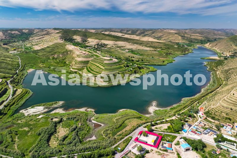 2024年6月23日,宁夏回族自治区固原市西吉县震湖乡,西吉震湖清澈碧透,梯田景观层层叠叠,与民宿、村落、绿植等,构成一幅夏日山水交融的美丽生态画卷。
