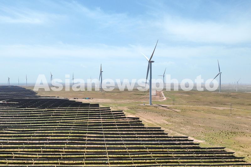 2024年6月29日,俯瞰位于宁夏银川市一处清洁能源基地,一座座电力风机与戈壁荒滩、矿井水域相映成景,源源不断地将绿色电能输送到千家万户。