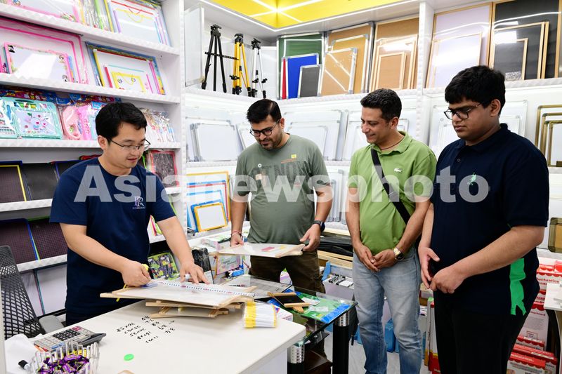 图片说明:2024年6月29日,浙江金华,在义乌国际商贸城三区的一门店里,来自印度的外商与商户(左一)在洽谈采购文教产品。