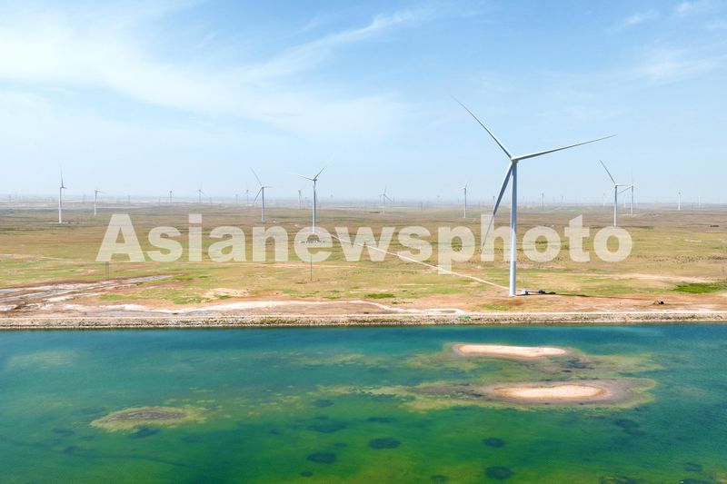 2024年6月29日,俯瞰位于宁夏银川市一处清洁能源基地,一座座电力风机与戈壁荒滩、矿井水域相映成景,源源不断地将绿色电能输送到千家万户。