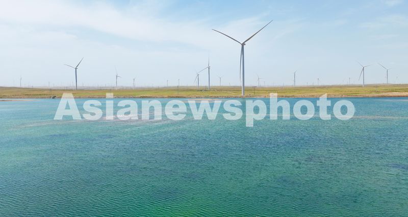 2024年6月29日,俯瞰位于宁夏银川市一处清洁能源基地,一座座电力风机与戈壁荒滩、矿井水域相映成景,源源不断地将绿色电能输送到千家万户。
