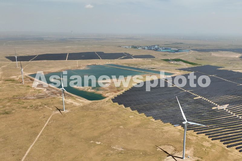 2024年6月29日,俯瞰位于宁夏银川市一处清洁能源基地,一座座电力风机与戈壁荒滩、矿井水域相映成景,源源不断地将绿色电能输送到千家万户。