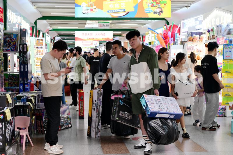 图片说明:2024年6月29日,浙江金华,在义乌国际商贸城一区的玩具购物旅游特色区,客商和游客采购大包小包的玩具满载而归。
