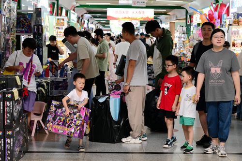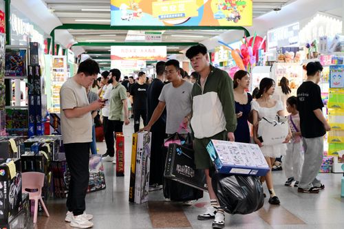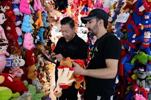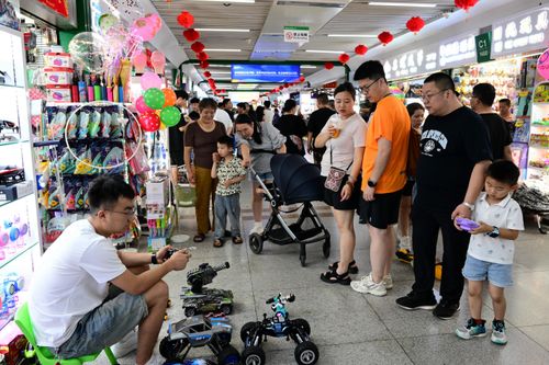 图片说明:2024年6月29日,浙江金华,在义乌国际商贸城玩具购物旅游特色区,来自哥伦比亚的外商在洽谈采购电动玩具。