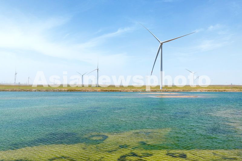 2024年6月29日,俯瞰位于宁夏银川市一处清洁能源基地,一座座电力风机与戈壁荒滩、矿井水域相映成景,源源不断地将绿色电能输送到千家万户。