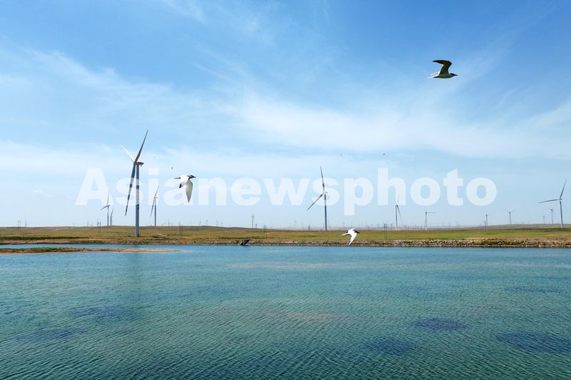 2024年6月29日,俯瞰位于宁夏银川市一处清洁能源基地,一座座电力风机与戈壁荒滩、矿井水域相映成景,源源不断地将绿色电能输送到千家万户。