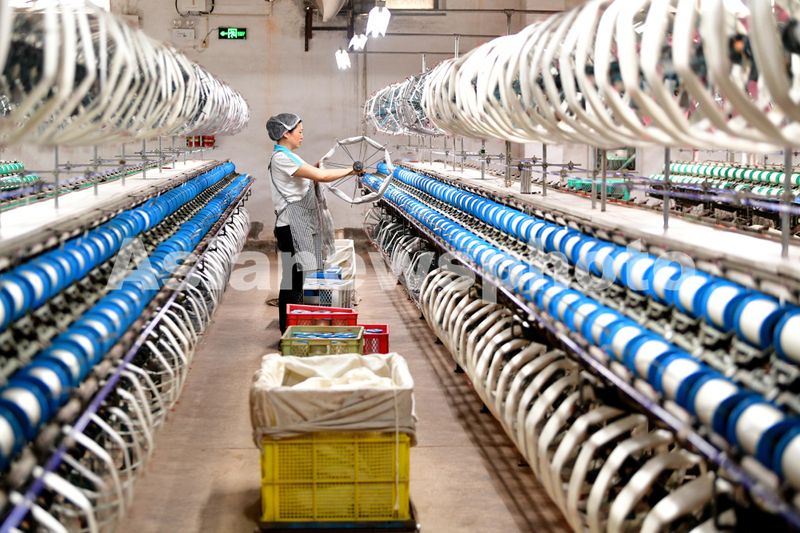 图片说明:2024年7月2日,江苏海安,在全国首批农业产业化国家重点龙头企业——鑫缘茧丝绸集团股份有限公司,工人在丝线准备车间忙碌。