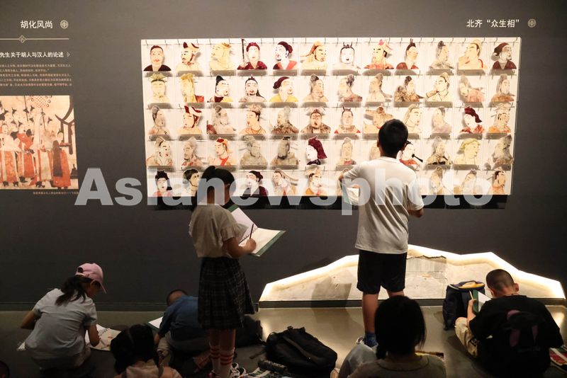 7月4日,小朋友在山西省太原北齐壁画博物馆馆内写生。