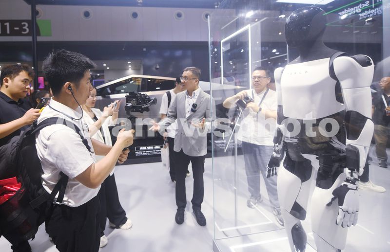 2024年7月4日,观众在2024世界人工智能大会上参观特斯拉推出的第二代擎天柱(Optimus)人形机器人。