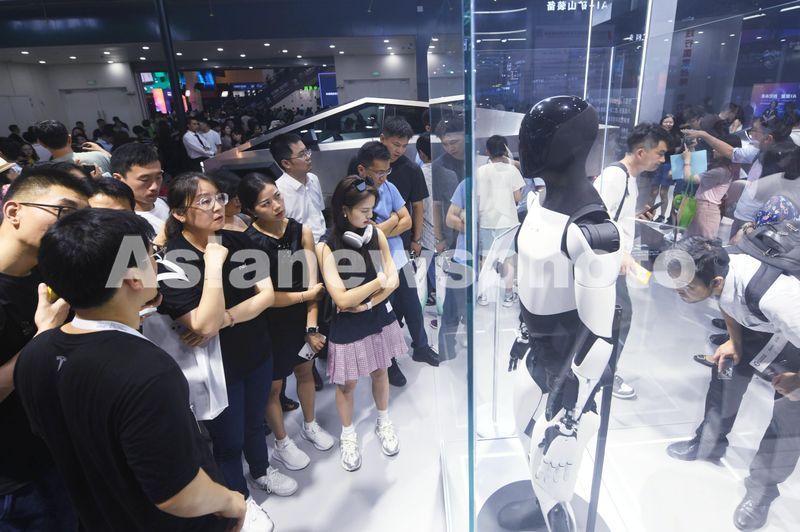 2024年7月4日,观众在2024世界人工智能大会上参观特斯拉推出的第二代擎天柱(Optimus)人形机器人。