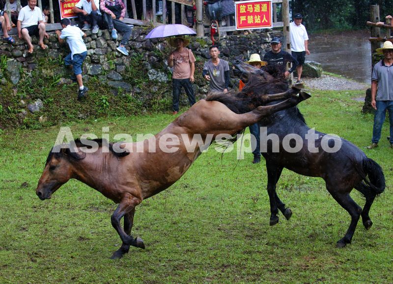 2024年7月13日,在广西融水苗族自治县安太乡小桑苗寨,两匹骏马在进行激烈的撕打。