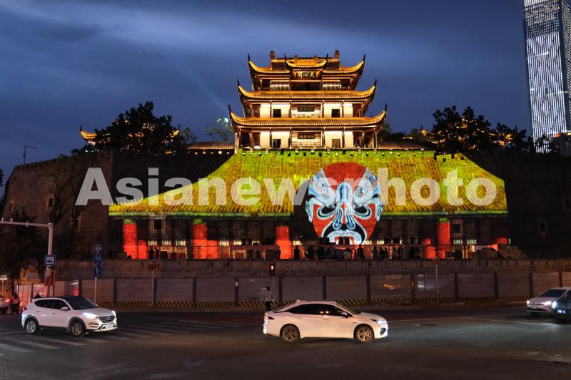 2024年7月15日晚,许多市民在长沙天心阁观看灯光秀调试,感受长沙文化以及光影魅力。