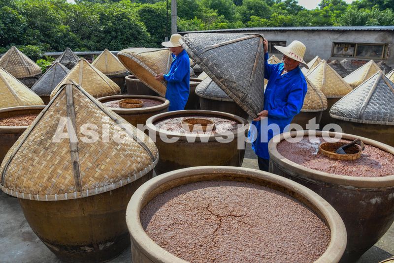 2024年7月17日,浙江省金华市婺城区白龙桥镇公盛食品酿造厂晒场上,师傅们利用晴好天气酿晒酱油。