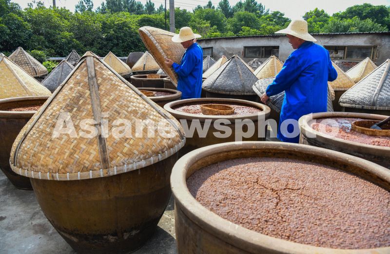 2024年7月17日,浙江省金华市婺城区白龙桥镇公盛食品酿造厂晒场上,师傅们利用晴好天气酿晒酱油,让大缸里的酱料充分发酵。