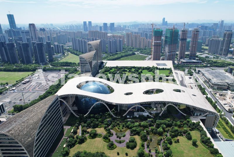 图片说明:2024年7月18日,从空中俯瞰杭州国际博览中心的空中花园。