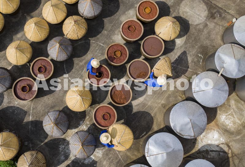 2024年7月17日,浙江省金华市婺城区白龙桥镇公盛食品酿造厂晒场上,师傅们利用晴好天气酿晒酱油,让大缸里的酱料充分发酵。