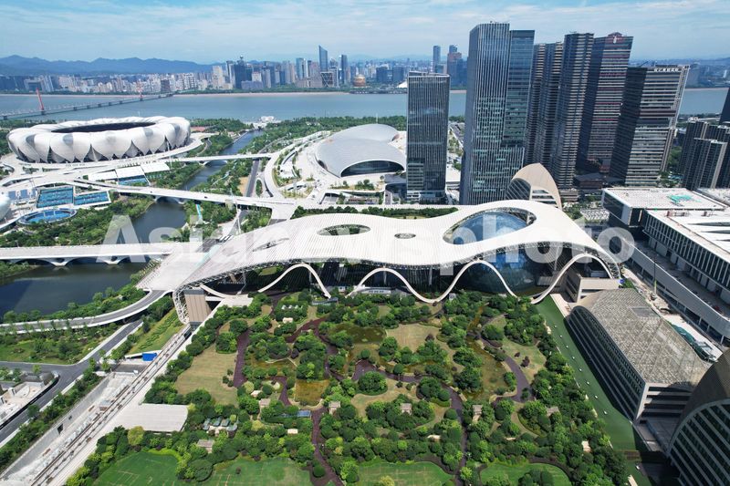 图片说明:2024年7月18日,从空中俯瞰杭州国际博览中心的空中花园。
