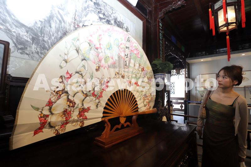 2024年7月18日,游客在苏式扇艺展上参观。近日,“苏式扇艺展”在江苏苏州古典园林狮子林举办,展览以“狮林真趣 雅物清风”为主题,展出18位艺术家创作的75件苏扇和扇面作品,为游客奉献一场精美绝伦的扇艺文化大餐。此次展览将持续至8月15日。