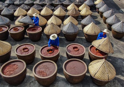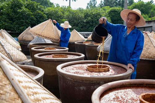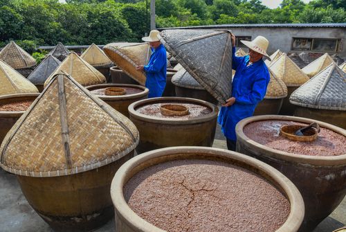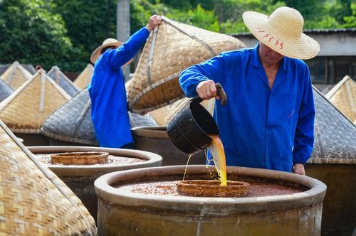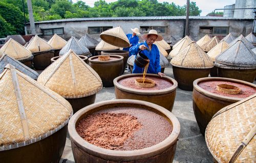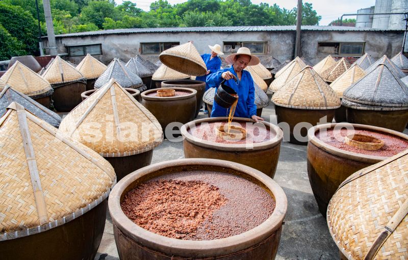 三伏天正是酿晒酱油时节,把煮熟黄豆拌入小麦粉的酱料放进大缸,通过阳光高温作用,让微生物把蛋白质分解转化为氨基酸。 “公盛酱油”创建于清光绪二年(1876年),是一家百年老字号,采用传统酿造工艺制成的酱油,有着“色泽红润、酱香浓郁、味道醇鲜”特点。