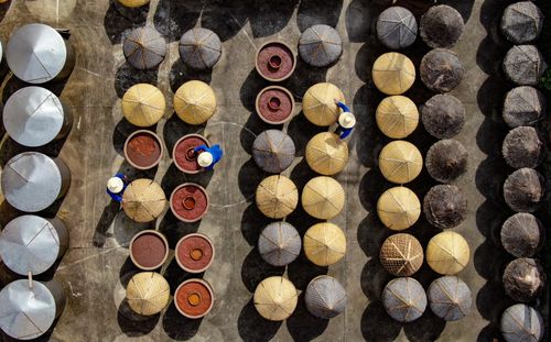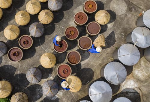 2024年7月17日,浙江省金华市婺城区白龙桥镇公盛食品酿造厂晒场上,师傅们利用晴好天气酿晒酱油,让大缸里的酱料充分发酵。