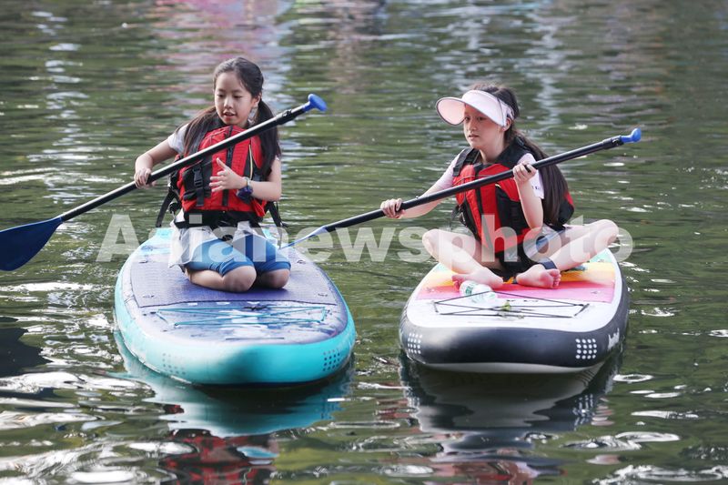 2024年7月20日,浆板运动爱好者在北京市朝阳区亮马河水面体验浆板。