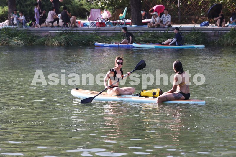 2024年7月20日,高温来袭,不少桨板和皮划艇爱好者在北京亮马河水面上划行,享受运动快乐,觅夏日清凉。