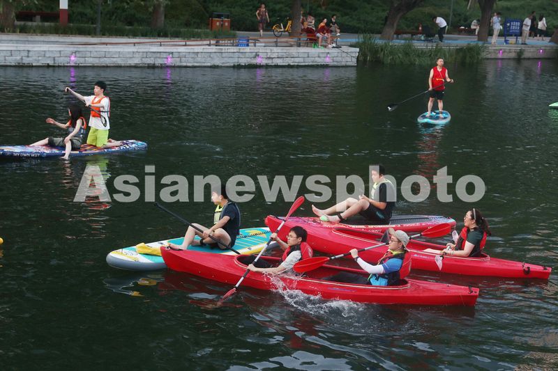 2024年7月20日,高温来袭,不少桨板和皮划艇爱好者在北京亮马河水面上划行,享受运动快乐,觅夏日清凉。