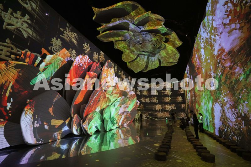 2024年8月6日,观众在中国国家博物馆观看“华彩万象——石窟艺术沉浸体验”展。本次沉浸体验展陈空间约1500平米,艺术家结合数字绘制、数字影像和AI算法技术,以当代眼光和独特视角来表现、挖掘和阐释克孜尔石窟、敦煌莫高窟、麦积山石窟、云冈石窟和龙门石窟的艺术风格与丰富内涵。