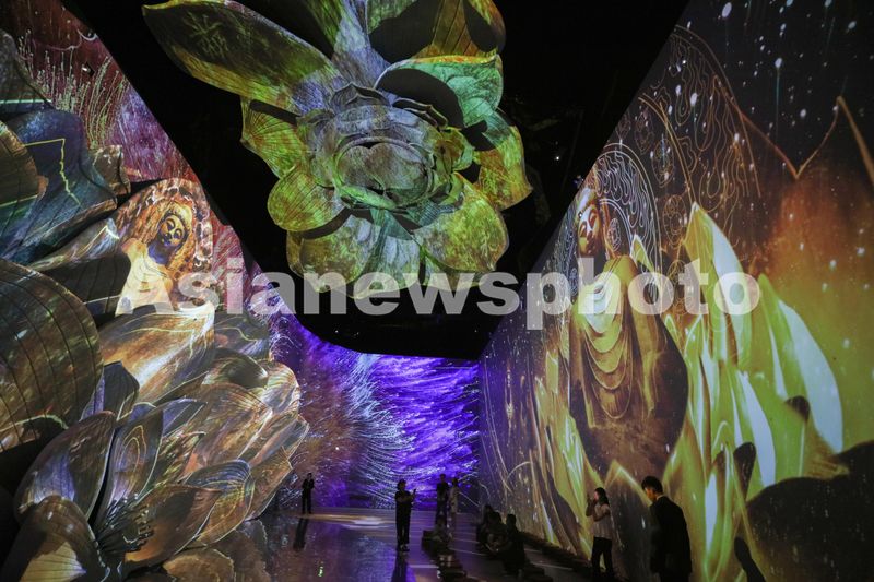 2024年8月6日,观众在中国国家博物馆观看“华彩万象——石窟艺术沉浸体验”展。本次沉浸体验展陈空间约1500平米,艺术家结合数字绘制、数字影像和AI算法技术,以当代眼光和独特视角来表现、挖掘和阐释克孜尔石窟、敦煌莫高窟、麦积山石窟、云冈石窟和龙门石窟的艺术风格与丰富内涵。