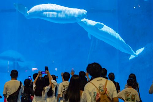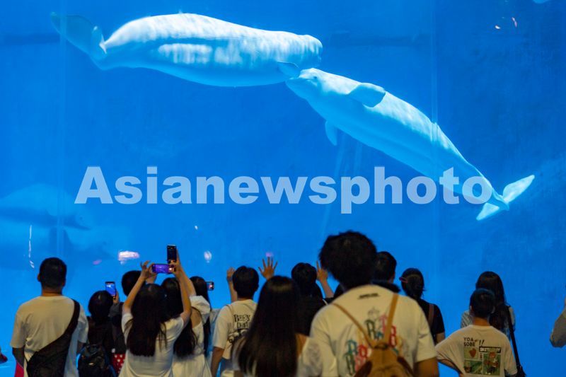 2024年8月10日,重庆市沙坪坝区重庆融创海世界,游客在观看白鲸。