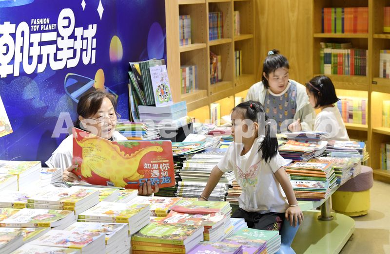 2024年8月12日,天气炎热,在安徽省合肥市一处新华书店,小朋友和家长一起阅读。