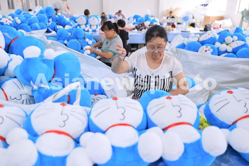 图片说明:2024年8月15日,在江苏省连云港市赣榆区厉庄镇一家玩具企业的车间内,工人在生产出口国外市场的毛绒玩具。