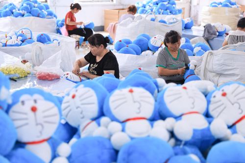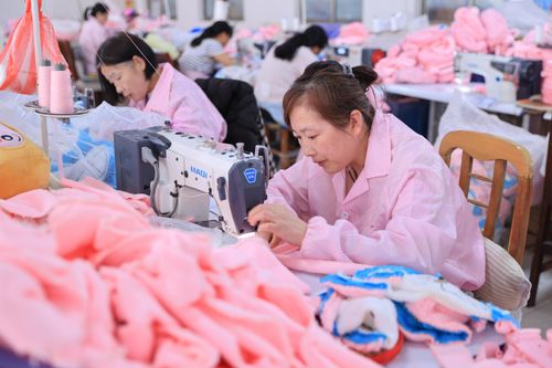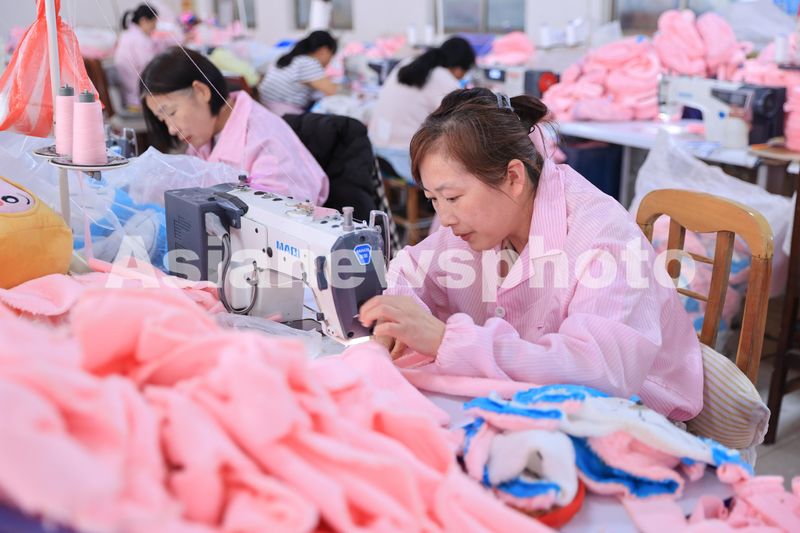 图片说明:2024年8月15日,在江苏省连云港市赣榆区厉庄镇一家玩具企业的车间内,工人在生产出口国外市场的毛绒玩具。