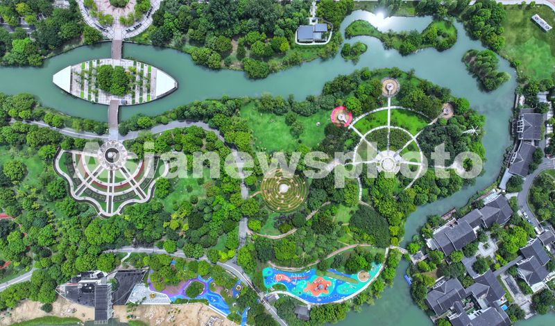 图片说明:2024年8月15日是第二个全国生态日,俯瞰江苏省张家港市梁丰生态园,绿草如茵,树木繁茂。