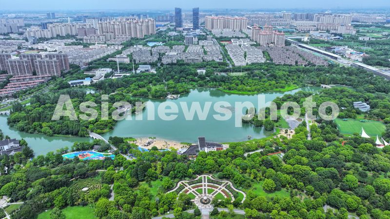 图片说明:2024年8月15日是第二个全国生态日,俯瞰江苏省张家港市梁丰生态园,绿草如茵,树木繁茂。