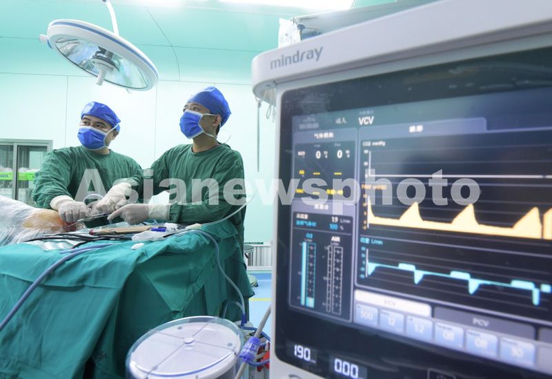 2024年8月19日,在河北省石家庄新乐市中医医院手术室,医生在为患者做手术。当日是第七个中国医师节,各地医师坚守岗位,在工作中迎接自己的节日。今年中国医师节的主题是“崇尚人文精神,彰显医者仁心”。