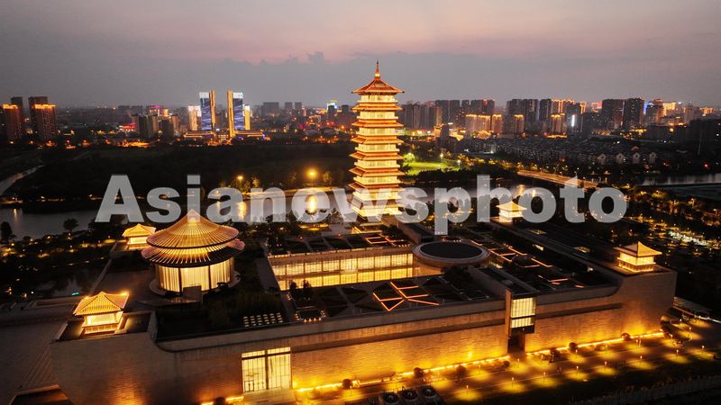 2024年8月17日,扬州中国大运河博物馆夜景璀璨。 夏日夜晚,位于江苏省扬州市广陵区三湾湿地的扬州中国大运河博物馆流光溢彩、灯光璀璨,与大运河交相辉映,一幅秀美的大运河夜景画面。