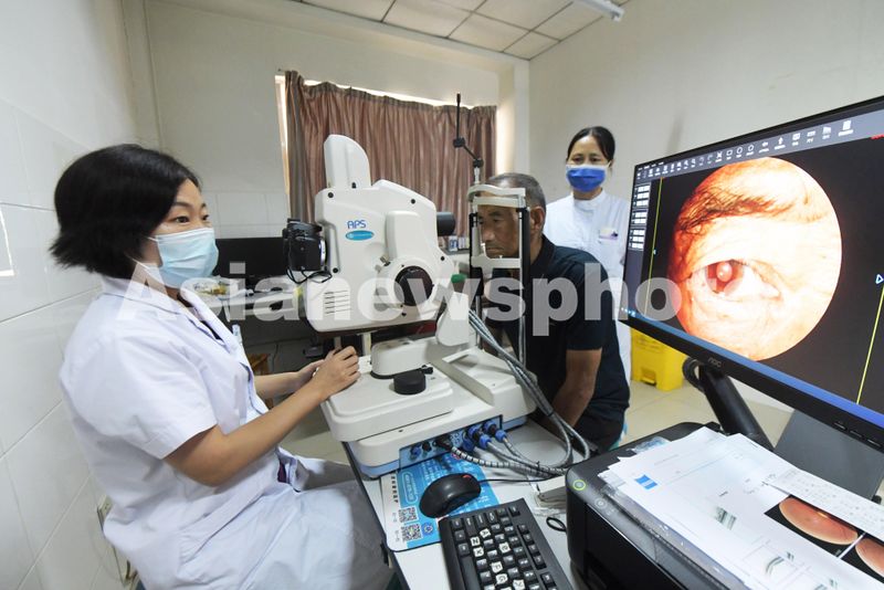 2024年8月19日,在河北省石家庄新乐市中医医院眼科,医生在为患者检查眼睛。
