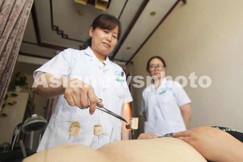 2024年8月19日,在河北省石家庄新乐市中医医院针灸科,医生在为患者做温针治疗。