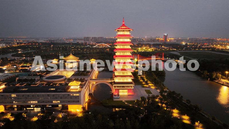 2024年8月17日,扬州中国大运河博物馆夜景璀璨。 夏日夜晚,位于江苏省扬州市广陵区三湾湿地的扬州中国大运河博物馆流光溢彩、灯光璀璨,与大运河交相辉映,一幅秀美的大运河夜景画面。