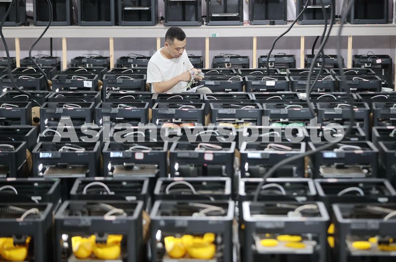图片说明:2024年8月21日,浙江省湖州市德清县下渚湖街道上杨村一家3D打印工厂,工人在操作3D打印机赶制定单玩具。